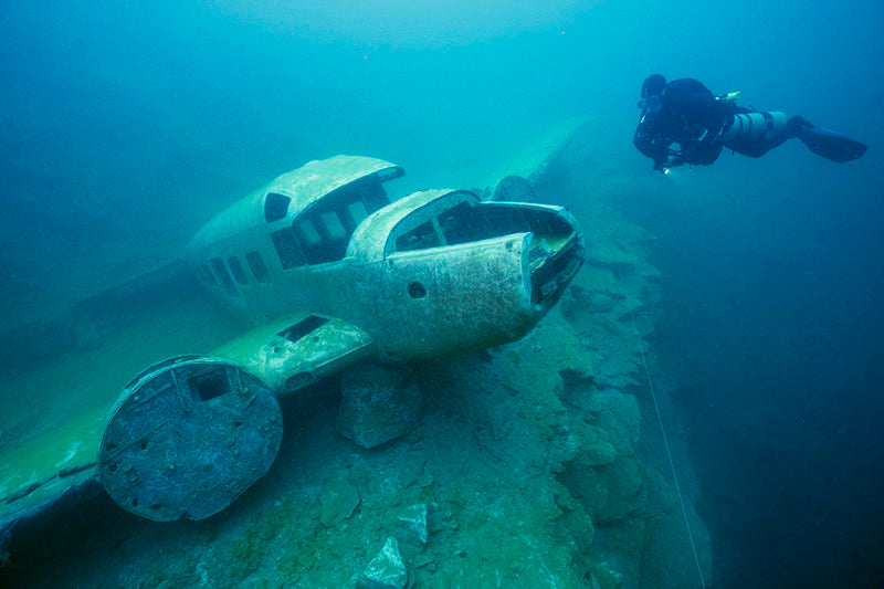A small plane lies in a freshwater quarry in Quebec, one of the first stops on their expedition.
