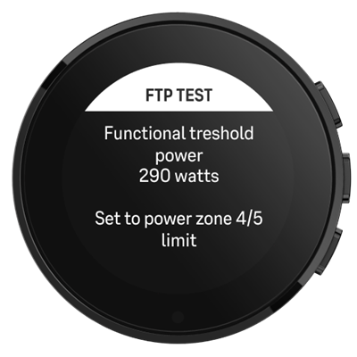 Once you select the sports app in your watch, the test will start with the workout start. The first 15 minutes are a warmup. At the end of this, notifications will inform you to get prepared to start the test. The test will last for 20 minutes, during this period ride as hard as you can with constant power. You can follow the time left and the power values. After 20 minutes you will get an estimation of your functional threshold. Set this as your zone 4/5 limit in cycling power zones.