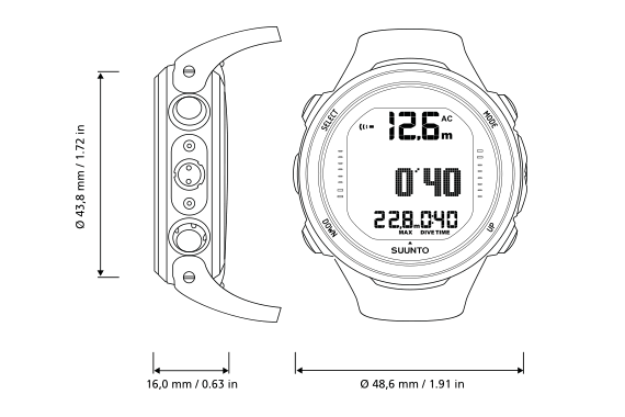 Dive alarms and notifications, and digital compass features with Suunto RGBM decompression model